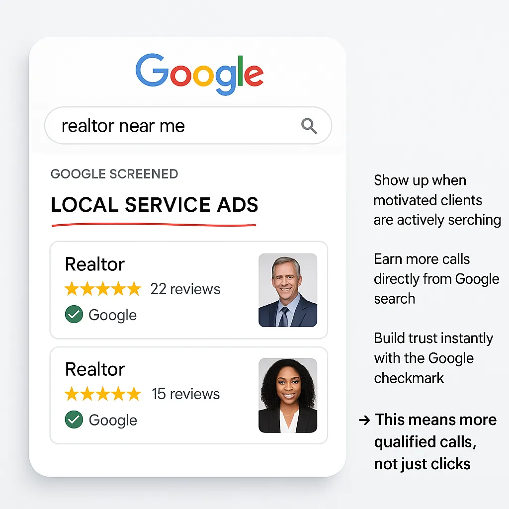 Be the agent buyers and sellers see first when they search “Realtor near me.” With Google’s Local Service Ads, you get priority placement at the very top of search results—complete with the Google Screened badge for instant credibility.