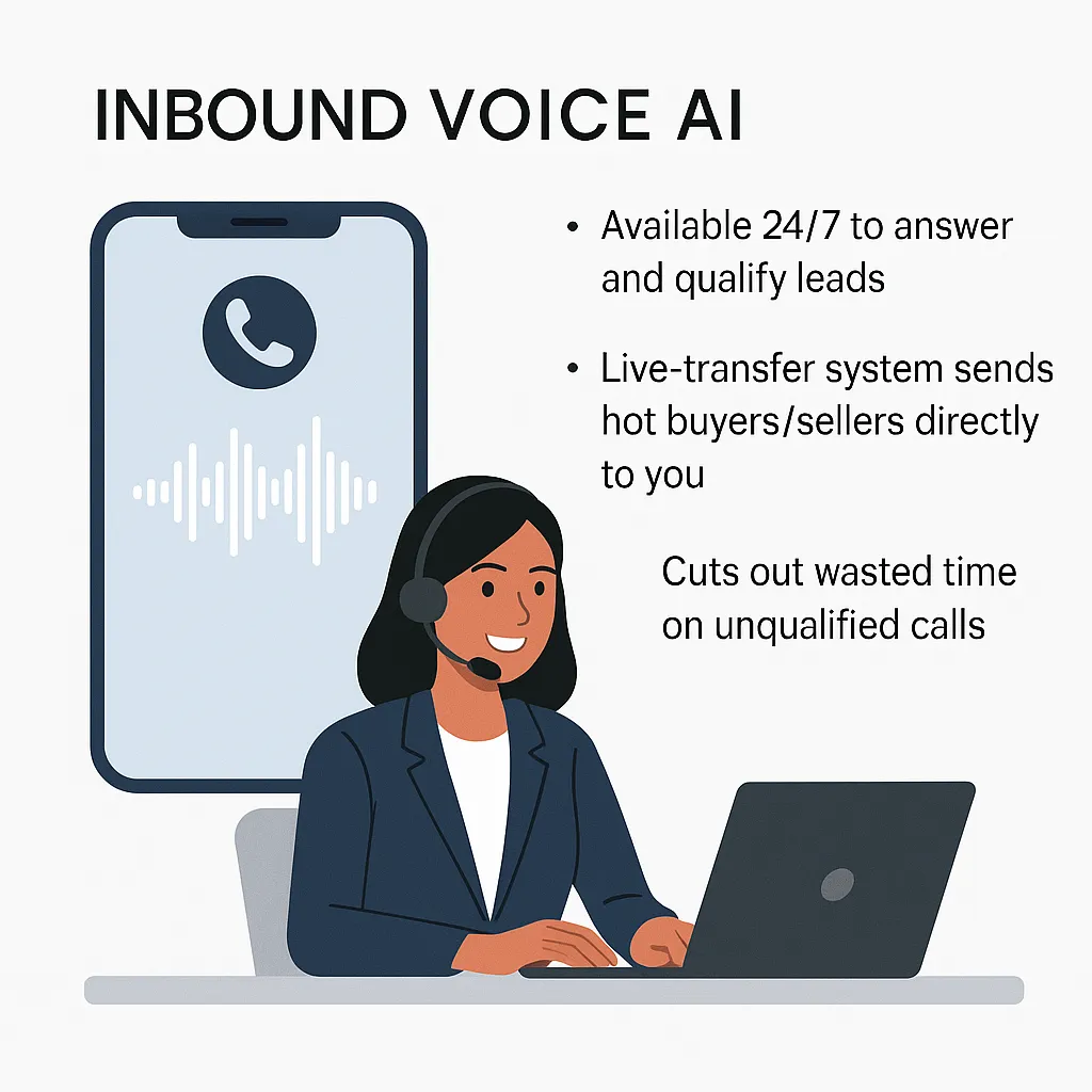 Never miss another opportunity. Our Inbound Voice AI answers calls instantly, fields questions, and qualifies leads in real time. Hot prospects can be live-transferred to you immediately—so you’re always the first agent they talk to.